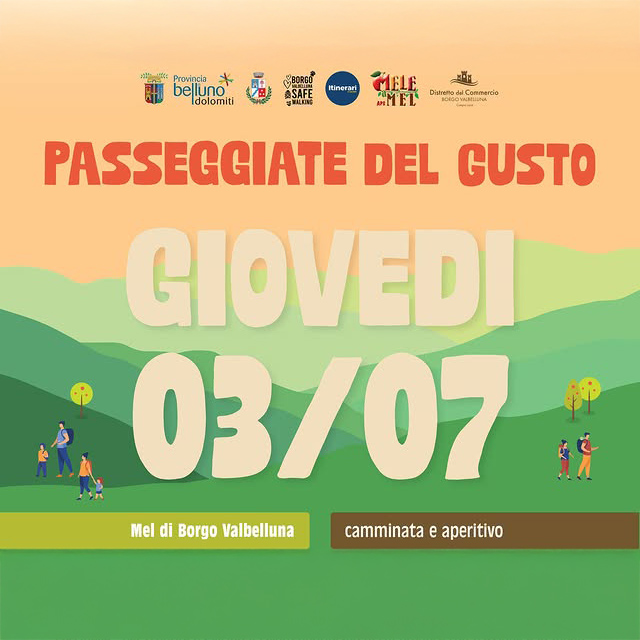 Giovedì 3 luglio ti aspettiamo per una nuova tappa delle Passeggiate del Gusto: partiremo alle 18.15 dal parcheggio del supermercato Di Più (Mel, Borgo Valbelluna) per un’escursione accompagnata da Borgo Valbelluna Safe Walking APS.